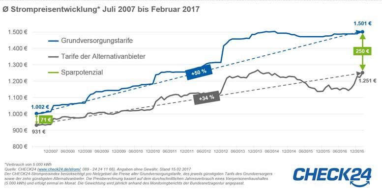 Durch höhere EEG-Umlage und Netzentgelte sowie steigende Spotmarktpreise an der Strombörse werden auch die Tarife der Alternativanbieter teurer. 5.000 KWh Strom kosten aktuell (Stand Februar 2017) im Schnitt 1.251 Euro. Dennoch wird ein Stromanbieterwechsel immer lukrativer: Bei Wechsel im Februar 2017 spart ein Vierpersonenhaushalt im Schnitt 250 Euro pro Jahr. Vor zehn Jahren waren es nur 71 Euro.
