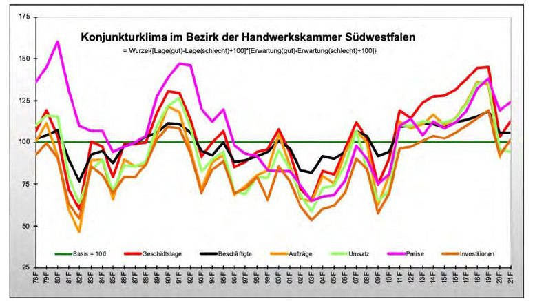 1978 bis 2021: die Konjunkturindizes im Überblick bezogen auf einen Normwert von 100