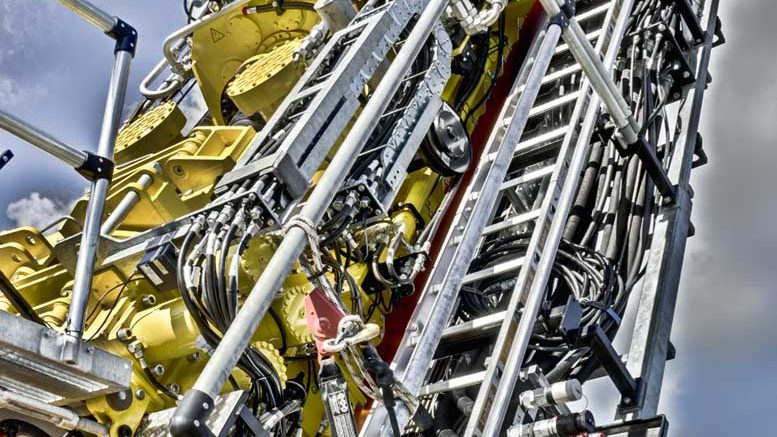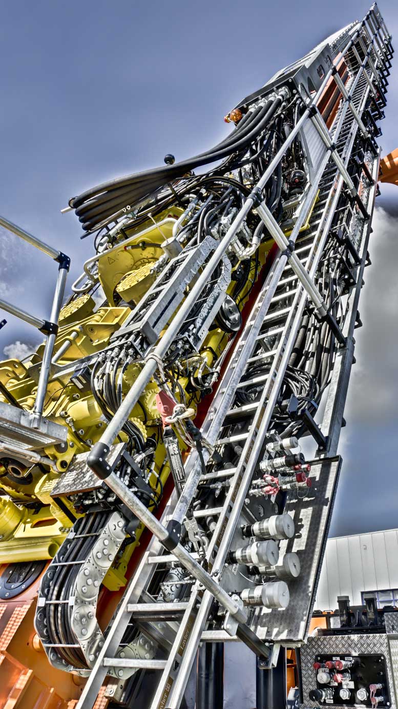 Die Energieführungsketten von TSUBAKI KABELSCHLEPP sind seitlich an den Lafettenmasten der Bohranlagen von Prime Drilling angebracht und führen bzw. schützen die Hydraulikschläuche.