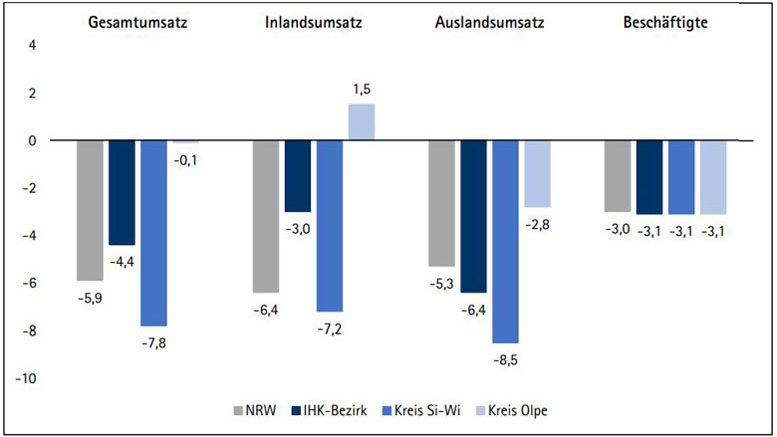 Zwischen den beiden Kreisen des IHK-Bezirkes ist ein deutlicher Unterschied zu beobachten. Während die Unternehmen aus dem Kreis Olpe in den ersten beiden Monaten das Umsatzniveau des Vorjahres nahezu erreichen konnten (-0,1 Prozent), verzeichneten die Unternehmen aus Siegen-Wittgenstein Einbußen von 7,8 Prozent. IHK-Konjunkturexperte Stephan Häger: „Die Unternehmen aus dem Kreis Olpe haben einen wirklich ordentlichen Start ins neue Jahr hingelegt. Während der Auslandsumsatz in den ersten beiden Monaten noch unter dem Vorjahresniveau lag (-2,8 Prozent), stieg der Inlandsumsatz um 1,5 Prozent. Dagegen verbuchten die Unternehmen aus Siegen-Wittgenstein sowohl im Auslandsumsatz mit -8,5 Prozent als auch im Inland mit -7,2 Prozent deutliche Einbußen.“