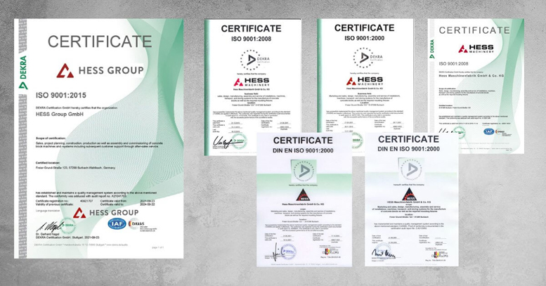Sowohl Vertrieb, Projektplanung, Konstruktion und Produktion als auch Montage und Inbetriebnahme der Betonsteinmaschinen und Anlagen bis zu der darauffolgenden Kundenbetreuung durch den After Sales Service der HESS GROUP erfüllen die hohen Anforderungen der Zertifizierung von der DEKRA Certification GmbH. Damit unterstreicht das Unternehmen den eigenen Anspruch an transparente Prozessabläufe. Durch die Integration des Qualitätsmanagements ist es weiterhin möglich, Bereiche, die eine Verbesserung erfordern, besser zu identifizieren, Maßnahmen zu entwickeln, diese zu testen und zu implementieren.