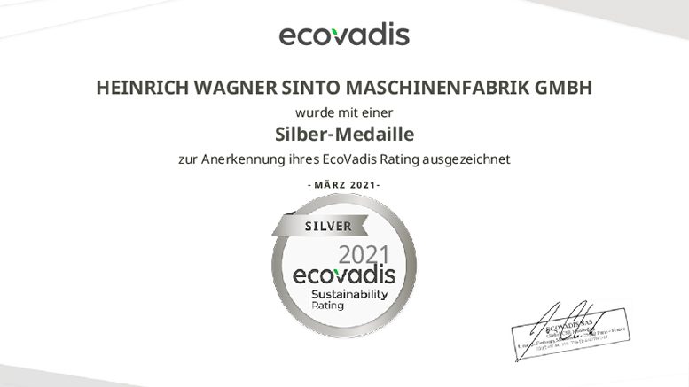 Im März 2021 wurde die Heinrich Wagner Sinto Maschinenfabrik von der Ecovadis SAS Paris für Ihre nachhaltige Unternehmenspolitik ausgezeichnet. Im Rahmen des Audits wurden Aktivitäten aus den Bereichen Umweltschutz, Arbeitsschutz und Menschenrechte, Ethik und nachhaltige Beschaffung zertifiziert.