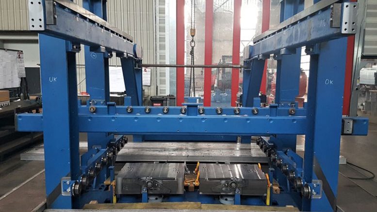Bei der Heinrich Wagner Sinto Maschinenfabrik GmbH in Bad Laasphe wird derzeit eine neue Zwillings-Formanlage „ZFA-S 4“ mit einer Formkastengröße von 850 x 650 x 250 / 250 mm aufgebaut. Das Bild zeigt die Formmaschine in einem frühen Stadium der Montage.