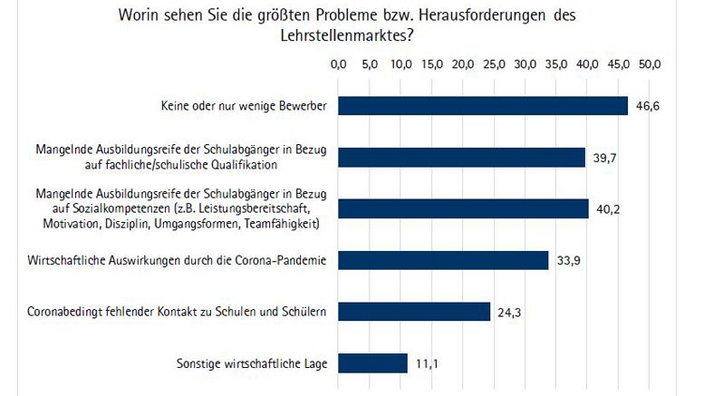 Ein weiteres wichtiges Umfrageergebnis: 40 % der befragten Firmen attestieren den Schulabgängern „mangelnde Ausbildungsreife“. Hier führen die Unternehmen sowohl fehlende fachliche Qualifikationen als auch mangelnde Sozialkompetenzen ins Feld. Rund 24 % der Firmen sehen in dem Corona-bedingt fehlenden Kontakt zu Schülerinnen und Schülern eine große Herausforderung. Ein Problem, das sich auch im betrieblichen Ausbildungsalltag festmachen lässt. 32 % der Firmen geben an, dass die schulischen Leistungen ihrer Auszubildenden durch den Distanzunterricht beeinträchtigt werden. Die Berufskollegs stehen vor der gewaltigen Aufgabe, die durch das verstärkte Home-Schooling erzeugten fachlichen Defizite nach einer kompletten Wiederöffnung schnell auszugleichen, betont Sabine Bechheim: „Immerhin halten 12 % der Firmen den Ausbildungserfolg für gefährdet. Das sollte zu denken geben. Dies jedoch ist nicht das einzige Problem, das die langen Schulschließungen nach sich ziehen. Von einer geregelten Berufsorientierung kann in den allgemeinbildenden Schulen derzeit keine Rede sein.“ Die persönliche Kontaktaufnahme mit Schülern sei für die Firmen, die Agentur für Arbeit und die Kammern bei geschlossenen Schulen so gut wie unmöglich. Zudem hätten die Schulen der Sekundarstufen I und II derzeit anderes im Sinn, als sich über die Berufsorientierung ihrer Abgangsklassen Gedanken zu machen.