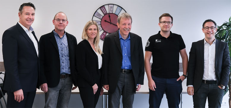 Stellten den Stresstest IT-Sicherheit der IHK Siegen vor (v.l.n.r.): Hans-Peter Langer, Markus Tesche, Bianca Stolte-Reeh, Roger Schmidt, Maurice Rothe und Sobol (beide SVASystem Vertrieb Alexander GmbH).