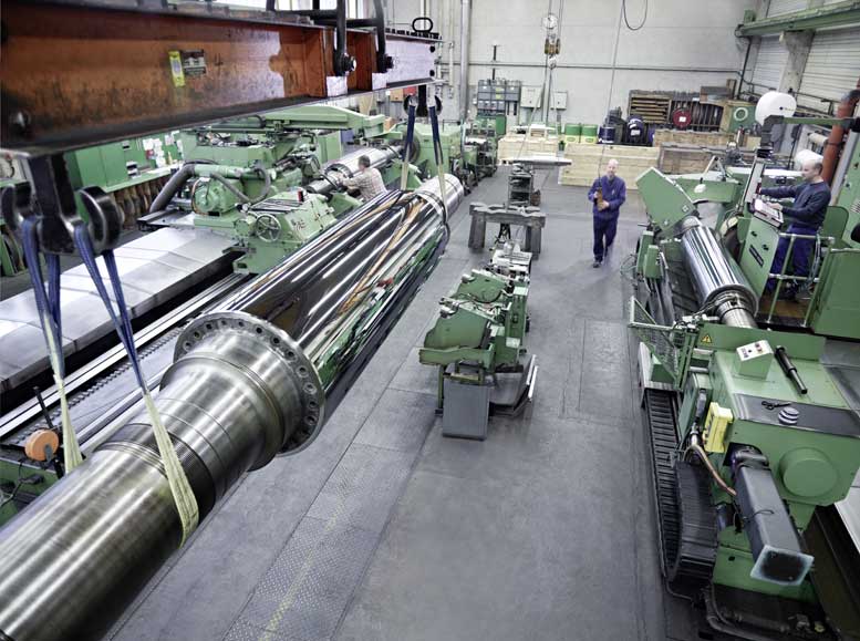 Ein Blick in die Schleifhalle. Vorne hängt eine Kalanderwalze am Kran. Sie verfügt über periphere Bohrungen und über eine verchromte und polierte Ballenoberfläche.