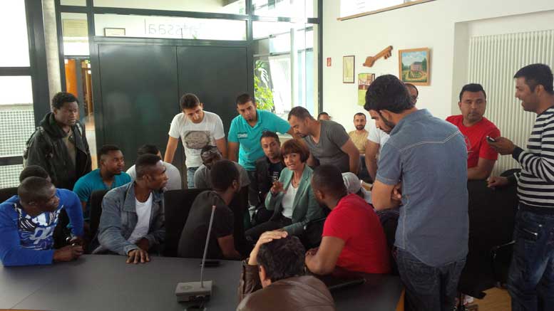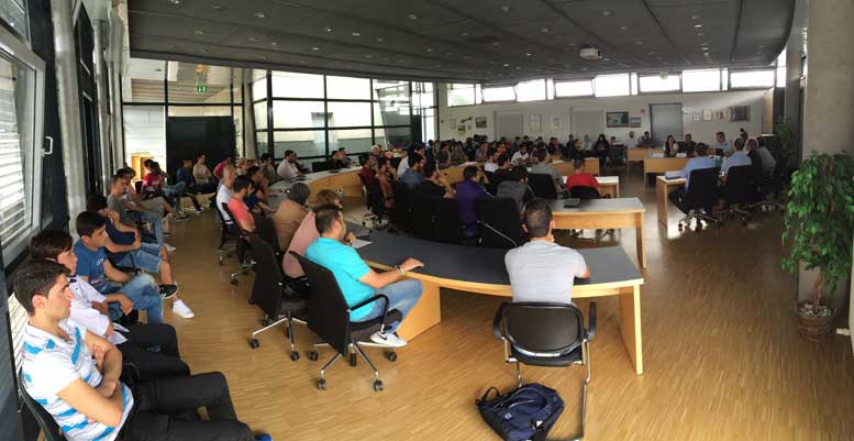 Doch nur mit Sprachkenntnissen alleine sei es nicht getan, betont Dr. Wolf. „Wir wissen aus unserer über einjährigen Erfahrung mit geflüchteten Menschen, dass für viele von ihnen erst eine Qualifizierung notwendig ist“, erklärt sie. Nicht bei allen ruft sie damit Begeisterung hervor, denn viele sind motiviert direkt zu arbeiten. Darum kommen viele Fragen auf und so wird nach dem allgemeinen Vortrag die große Gruppe aufgeteilt. Je ein Dolmetscher und ein Mitarbeiter des Integration Points und Dr. Wolf setzen sich mit der jeweiligen Sprachgruppe zusammen. So lassen sich die Fragen schneller und direkter beantworten.