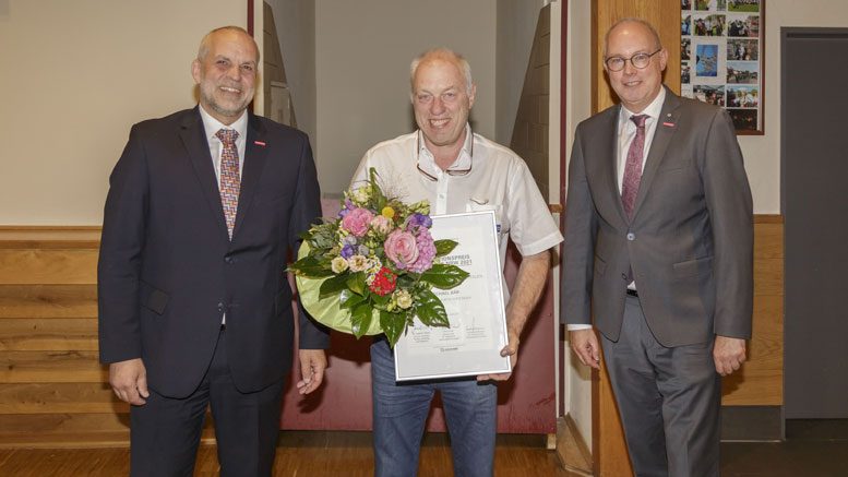 Handwerkskammerpräsident Jochen Renfordt (l.) und Hauptgeschäftsführer Meinolf Niemand (r.) gratulierten Michael Bär zur Auszeichnung mit dem Integrationspreis. ­(© Markus Kluft/Handwerkskammer Südwestfalen)