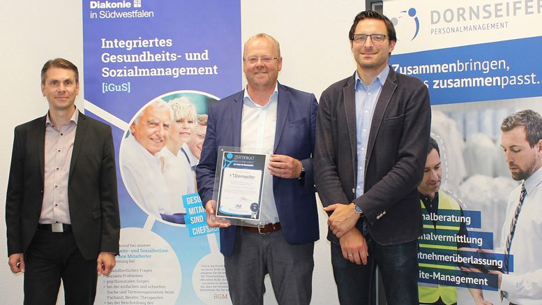 Seminare für Führungskräfte, Tipps zur Gesundheitsförderung und eine Hotline, die sich den Sorgen und Nöten der Arbeitnehmer annimmt: Dies und noch viel mehr bietet das integrierte Gesundheits- und Sozialmanagement (iGuS) der Diakonie in Südwestfalen. Rund 30 Firmen aus der Region greifen mittlerweile auf das Angebot des Teams rund um Geschäftsführer Sebastian Schreiber zurück. Eines dieser Unternehmen ist die Dornseifer Personalmanagement GmbH mit Standorten in Siegen, Attendorn, Lüdenscheid sowie Leipzig und Halle an der Saale. Die „iGuS“-Kooperation brachte der Firma nun eine Auszeichnung ein: Bei der Preisverleihung des Interessenverbandes Deutscher Zeitarbeitsunternehmen (IGZ) heimste Dornseifer Personalmanagement in der Kategorie „Mittlere Unternehmen“ den dritten Platz für „Herausragende Aktivitäten im Arbeits- und Gesundheitsschutz“ ein. „Dieser Award bestätigt uns auch darin, immer neue Ideen zu entwickeln. Wir sagen herzlichen Glückwunsch“, gratulierte Schreiber.