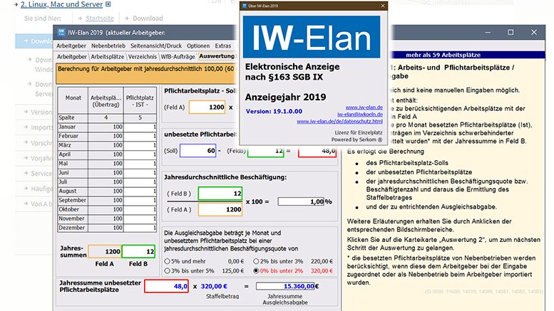 Sobald die Unternehmensdaten erfasst sind (per Import aus Personalsoftware, Datenübernahme aus dem Vorjahr oder Eingabe per Hand) rechnet das Programm aus, ob genügend Pflichtarbeitsplätze besetzt waren und – falls nicht – in welcher Höhe eine Ausgleichsabgabe zu zahlen ist. Die Anzeige kann dann ganz einfach elektronisch über eine Internetverbindung an die Bundesagentur für Arbeit geschickt werden. Einzig der von IW-Elan automatisch erzeugte Versandbeleg muss unterschrieben versandt werden.