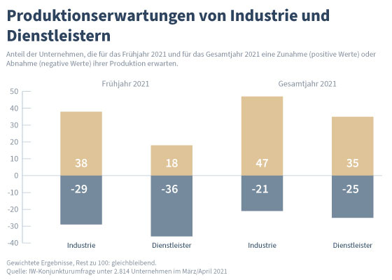 Im Dienstleistungssektor herrscht dagegen Niedergeschlagenheit, weil die meisten Geschäfte weiterhin geschlossen sind: 36 Prozent der Dienstleister sehen sich in einer noch schlechteren Position als während des ersten Lockdowns, nur 18 Prozent empfinden die Situation als besser. Aber auch hier hellt sich die Lage auf – weit mehr als ein Drittel erwartet für das Gesamtjahr 2021 ein Plus und nur noch ein Viertel ein Minus. „Die optimistischen Einschätzungen beruhen auf der Hoffnung, dass die Pandemie unter Kontrolle kommt und sich die Geschäfte bald wieder normalisieren“, sagt IW-Konjunkturexperte Grömling.