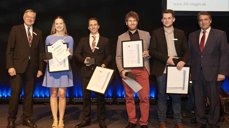 Beim Jahresempfang der IHK Siegen wurden am Dienstagabend die leistungsstärksten Auszubildenden des Prüfungsjahrgangs 2018 geehrt. IHK-Präsident Felix G. Hensel und der ehemalige Bundesaußenminister Sigmar Gabriel zeichneten die jungen Leute aus, die unter dem großen Beifall der anwesenden 1600 Gäste aus ihren Händen Weiterbildungsgutscheine im Wert von 500 Euro, Urkunden und Pokale erhielten.