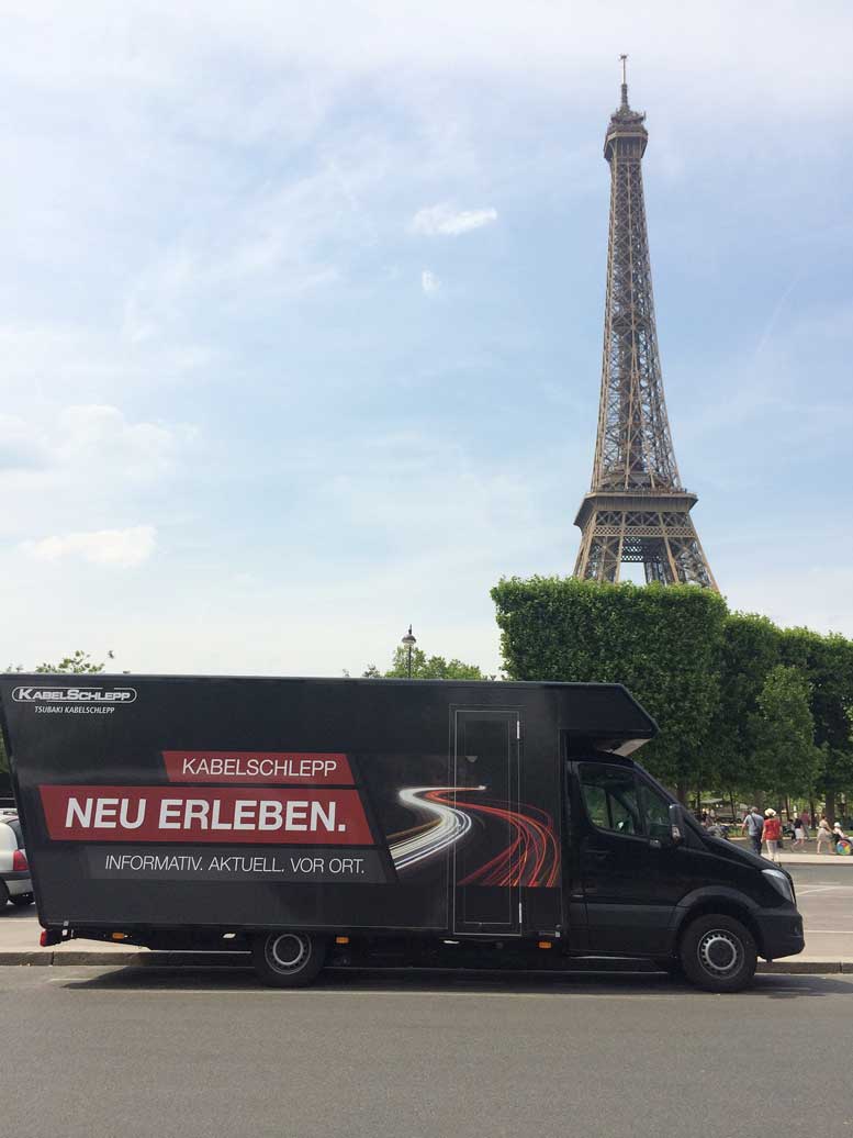 Schon im fünften Jahr kommt der zu einem „mobilen Messestand“ umgerüstete KABELSCHLEPP Roadshow-Bus direkt zu Kunden und Interessenten.