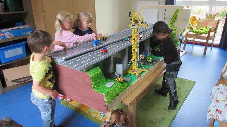 Gemeinsam mit dem erzieherischen Personal bauen die Kleinen die Baustelle derzeit als Spielzeug-Variante nach. „Auf diesem Weg können sie spielerisch etwas lernen“, betont Plate-Schneider. Die Arbeiten liefen hervorragend, fügt sie augenzwinkernd hinzu: „Mittlerweile ist unsere Fahrbahn in Richtung Dortmund schon dreispurig ausgebaut.“