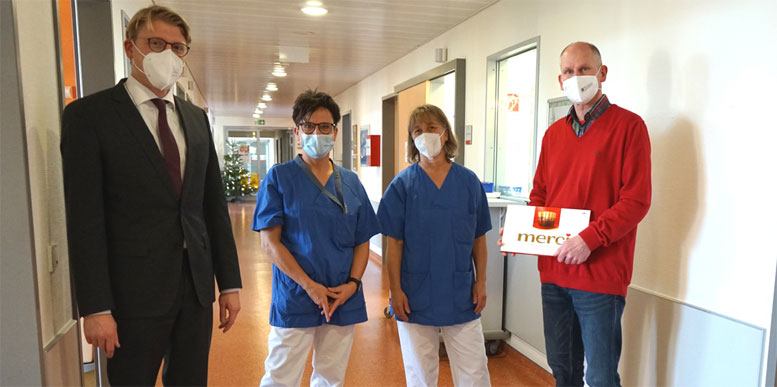 GF Dr. Martin Horchler (links) und der stellvertretende Betriebsratsvorsitzende Bert Hesse (rechts) beglückwünschen die Kinderkrankenschwestern Katrin Hofius (2. von links, 25 Jahre Firmenzugehörigkeit) und Karin Kraft (2. von rechts, 40 Jahre Betriebszugehörigkeit) symbolisch für alle Jubilare 2020 an ihrem Arbeitsplatz auf der Station 1.