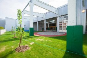 Draußen gibt es einen fast 100 m² großen Bolzplatz und eine Rasenfläche. Die Trennung zum angrenzenden Pflegeheim erfolgt durch eine einen Meter hohe Mauer. Der Kontakt zwischen Alt und Jung ist durch eine Gartentür möglich – und ausdrücklich erwünscht: Mit der angrenzenden Senioreneinrichtung wurde ein Kooperationsvertrag geschlossen, um Alt und Jung bei Kuchen, Spielen, Lesen und Erzählen zusammenzubringen.