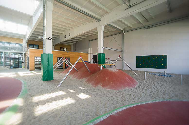 Die Spielflächen sind nach Norden orientiert, direkte Sonneneinstrahlung wird also vermieden. Die großzügige natürliche Belichtung der Halle erfolgt durch die Deckensektionaltore und die neu geschaffenen Oberlichter. Dank ihrer Überdachung und Ausstattung ist die Spielfläche in der Halle selbst bei frostigen Außentemperaturen, aber auch im heißen Sommer bei hoher UV-Belastung noch nutzbar. Das sorgt für ausgeglichene Kinder und ist ein ganz entscheidender Pluspunkt, der die Kita in der Kammgarnspinnerei annähernd einzigartig macht.