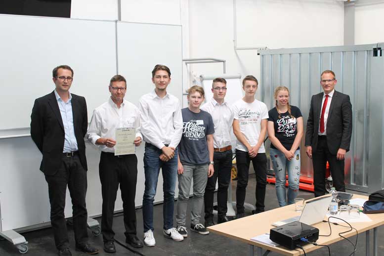 Das Rivius Gymnasium aus Attendorn belegte den 2. Platz. Mit im Bild MINTUS-Sprecher Professor Dr. Ingo Witzke (links) und Dr. Thorsten Doublet (rechts), Geschäftsführer der Arbeitgeberverbände Siegen-Wittgenstein.