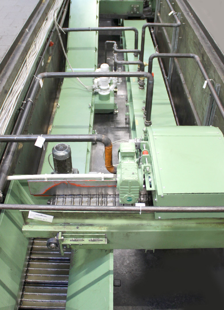 Im neuen Kratzerförderer (rechts im Bild) wird bei Voswinkel das Schneidöl vorfiltriert und über eine integrierte Hebestation zur zentralen Filteranlage gepumpt.