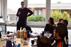 Vladimir Sizikov, Innovationsmanager bei Robert Thomas, berichtet den internationalen Studierenden beim gemeinsamen Frühstück von der Arbeit in einem mittelständischen Unternehmen.