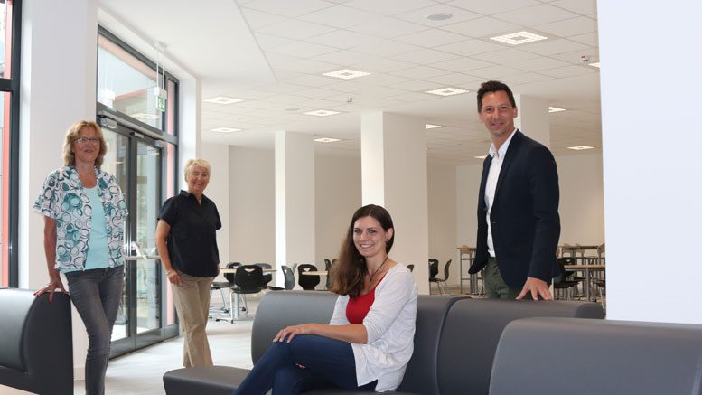 Einige Neuerungen gibt es auch am Berufskolleg Allgemeingewerbe, Hauswirtschaft und Sozialpädagogik (kurz: BK AHS). Hier können sich die 1.400 Schüler schon mal auf die Pausen in einer neuen Cafeteria freuen. Diese hatte der Kreis als zuständiger Schulträger des Berufskollegs erweitert und mit neuen Möbeln ausgestattet. Die Cafeteria ist von bisher rund 90 Quadratmetern auf künftig rund 220 Quadratmeter vergrößert worden. In den neuen Räumlichkeiten bieten jetzt gemütliche Lounge-Sessel und „Freischwinger“-Stühle Platz zum Essen und zum Selbststudium. Auch Veranstaltungen sollen in der neuen Cafeteria stattfinden. Die Baukosten für den Cafeteria-Anbau belaufen sich auf insgesamt 610.000 Euro, die größtenteils durch das Förderprogramm „Kommunalinvestitionsförderungsgesetz“ investiert wurden. Damit unterstützt der Bund gezielt kommunale Investitionen zur Sanierung, zum Umbau und zur Erweiterung von Schulgebäuden.