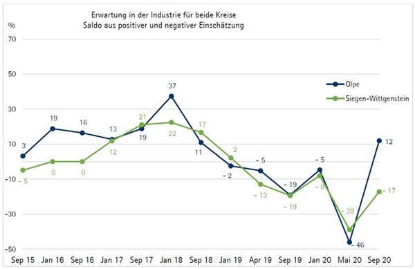 23 % der Betriebe aus Siegen-Wittgenstein und Olpe berichten von guten Geschäften, 34 % von schlechten. Die Erwartungen sind jedoch insgesamt deutlich optimistischer als im Frühjahr. 23% der Unternehmen blicken positiv in die Zukunft, 28 % sind pessimistisch. Der Saldowert steigt um 34 Punkte. Felix G. Hensel: „Die Sommermonate brachten eine konjunkturelle Erholung bei uns und in zahlreichen Ländern weltweit. Die Auftragseingänge steigen, die Produktion nimmt langsam wieder Fahrt auf. Wir werden aber nicht von heute auf morgen aus dem Tal herauskommen. Es wird nach unserer Einschätzung sehr lange dauern, zumal die Risiken wie Corona oder Brexit auf der Tagesordnung bleiben.“