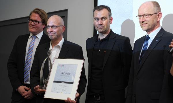 Matthias Muelln (2.v.l.) nahm den ersten “BOD” für seine Firma IT-aid GmbH, Siegen, entgegen. Die Jury-Mitglieder Patrick Schulte (links, billiton internet services GmbH Siegen) und Ulf Lück (2.von rechts, conception Kommunikationsagentur GmbH, Siegen) sowie Hermann-Josef-Droege, stv. Hauptgeschäftsführer der IHK Siegen, gratulierten.
