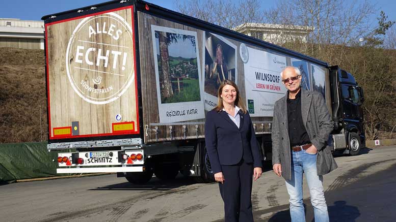 „Der Lkw dürfte der schönste in ganz Südwestfalen sein“, freute sich Wilnsdorfs Bürgermeisterin Christa Schuppler – natürlich mit einem Augenzwinkern und auch ein bisschen stolz, dass „ihre“ Kommune künftig auf den Straßen in ganz Deutschland auf originelle und sichtbare Weise vertreten ist. Für Guido Wertebach war es fast eine Selbstverständlichkeit, sich an der von der Südwestfalen Agentur initiierten Lkw-Kampagne zu beteiligen. „Ich bin mit Leib und Seele Wilnsdorfer und freue mich, auf diese Weise meine Gemeinde und die Region unterstützen zu können“, so der heimatverbundene Spediteur bei der offiziellen Vorstellung des Fahrzeugs. Marie Ting als Leiterin des südwestfälischen Regionalmarketings freut sich zudem über den anhaltenden Erfolg der Kampagne, die vor fast zwei Jahren in der Nachbargemeinde Burbach startete. Inzwischen rollen Südwestfalen-Lkw von acht verschiedenen Standorten aus durch ganz Europa – und weisen auf ebenso charmante wie unmissverständliche Weise auf die Vorzüge der Region hin. „Die Lkw-Auflieger sind für uns die beste Alternative, viele Menschen mit der Botschaft auf Deutschlands Straßen – bis ins Ausland – auf unsere Region aufmerksam zu machen.“