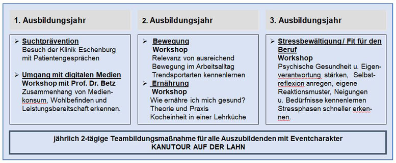 Das alles sind gute Gründe und Ansporn genug, die Gesundheit der Auszubildenden weiter zu fördern, in das Konzept des betrieblichen Gesundheitsmanagements neue Themen wie etwa den „Umgang mit digitalen Medien“ aufzunehmen und durch weitere Aktionen zu ergänzen. Zukünftig sieht das Konzept eine klare Aufteilung der Gesundheitsthemen auf die Ausbildungsjahre vor (s. Grafik). Generell soll durch das neue Konzept die psychische Gesundheit der Auszubildenden gestärkt und sie damit befähigt werden, ihr Berufsleben gesundheitsförderlich zu gestalten und sich selbstbestimmt zu entwickeln. „Wir möchten mit dem Programm die Motivation für eine gesunde Lebensweise fördern und die Auszubildenden bei der Eigenverantwortung für ihre Gesundheit unterstützen“, so Susanne Zabel und Annette Aulich. Deshalb soll auch nach Durchführung jeder einzelnen Maßnahme aktives Feedback mittels eines selbst entwickelten Feedbackbogens eingeholt werden, um das Konzept – falls erforderlich – immer wieder anpassen zu können.