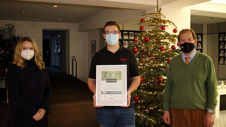 Nach seiner Auszeichnung als Bundessieger wurde Marius Latt jetzt auch als bester Auszubildender der EJOT Gruppe im Jahr 2021 mit dem Dieter-Ulbrich-Preis geehrt. Der 19-Jährige hatte seine Ausbildung zum Maschinen- und Anlagenführer mit der Note Sehr gut und 98 von 100 Punkten abgeschlossen. Diese Leistung ist umso höher zu bewerten, weil Marius Latt die Ausbildung in der Hälfte der Zeit absolviert hat, in einem statt in zwei Jahren.