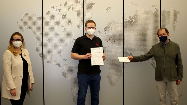Fabian Schneider nahm die Gratulation zu dieser herausragenden Leistung sowie eine finanzielle Gratifikation in Höhe von 500 Euro von Personal-Geschäftsführerin Angelika Wetzstein (links) und dem geschäftsführenden Gesellschafter der EJOT-Gruppe, Christian Kocherscheidt (rechts), entgegen.