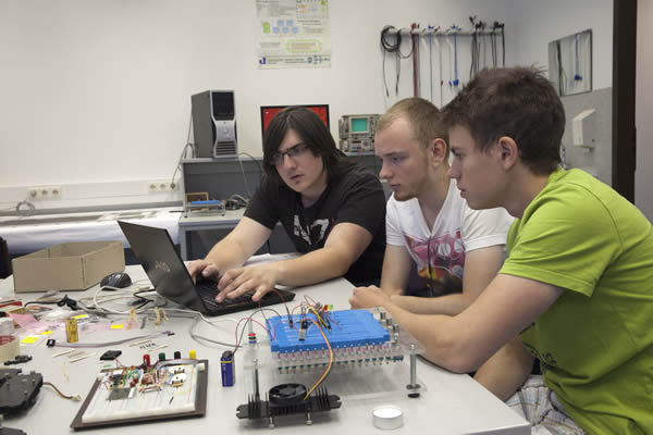 Ein weiterer Workshop richtete sich an Elektrotechnik- und Informatik-Interessierte. Sie realisierten unter Anleitung von Florian Otto und Alexander Keil eine temperaturgesteuerte Lüfterregelung mit einem Mikrocontroller. Die Teilnehmer, die im Laufe des Workshops auch ein Leiterplattenlayout entwerfen und realisieren und auch ein Programm in der Programmiersprache C entwickeln mussten, konnten ihre Arbeiten am Ende mit nach Hause nehmen und sie dann beispielsweise praktisch an einem Notebook testen.