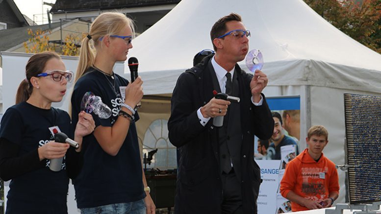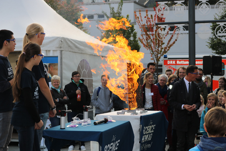Lodernde Flammen vor dem Kreishaus – kein Fall für die Feuerwehr – lediglich eines der zahlreichen Experimente zum Miterleben im Rahmen der MINT-Mitmachtage. Heute und morgen dreht sich in der Zeltstadt vor dem Kreishaus alles um die Disziplinen Mathematik, Informatik, Naturwissenschaften und Technik. Teilnehmende Kinder und Jugendliche aller Altersklassen bekommen die Gelegenheit z.B. naturwissenschaftliche Phänomene zu erforschen oder durch eigenen Körpereinsatz Elektrizität auf einem Fahrrad zu erzeugen. Unterstützt werden die Aktionen durch die Universität Siegen, das Berufskolleg Technik, die AWO Siegen-Wittgenstein, das Technikmuseum Freudenberg und mehrere heimische Schulen.