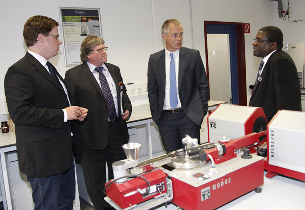 Johannes Remmel (2.v.r.) beim Rundgang diurch das HuK Umweltlabor. Mit ihm im Bild Vertreter der Geschäftsführung der Horn & Co. Gruppe, 2.v.l. Gert Horn.