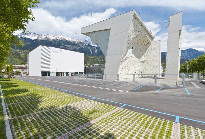 Auch für die Outdoor-Kletterer hat sich der Betreiber des Kletterzentrums, der Alpenverein Kletterzentrum Innsbruck GmbH, etwas einfallen lassen. Die drei Türme im Außenbereich sind so arrangiert, dass ca. 3.000 Zuschauer bei einem Wettkampf dem Geschehen teilhaben können. Auf einer Fläche von 1.500 m² können die Sportler vor atemberaubender Kulisse ihr Können beim Seilklettern demonstrieren, und auch Boulderer kommen auf einer Fläche von 175 m² auf ihre Kosten. Im Außenbereich sind die Kletterbegeisterten durch den fugenlosen Kunststoffboden playfix von BSW gesichert. Der ursprünglich für Fallschutz auf Spielplätzen entwickelte Boden hat sich auch für sportliche Bereiche bewährt, bei denen Sturzrisiken minimiert werden sollen.