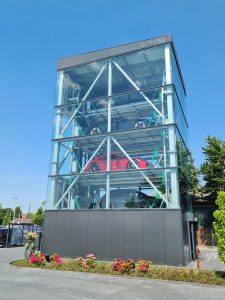 Die innovativen „Parktürme“ des Unternehmens E-Parktower aus Haltern bieten die Möglichkeit, auf jedem Parkplatz Elektroautos aufzuladen. Für die Strom- und Datenversorgung der in Paternostertechnik aufgebauten Parktower sorgen individuell konzipierte Energieführungsketten von TSUBAKI KABELSCHLEPP. Die in dieser Form einzigartigen Systeme wurden von den beiden Unternehmen gemeinsam entwickelt.