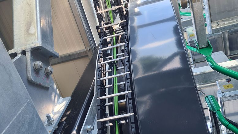 „Wir entwickelten eine Energieführungskette mit zwei Einspeisepunkten“, erläutert Samuel Heinrich, Anwendungsingenieur bei TSUBAKI KABELSCHLEPP. „Über diese zwei Einspeisepunkte werden jeweils die Hälfte der Leitungen in die Kette eingeführt und treten dann an einem Übergabeblech in der Mitte der Kette wieder aus.“ Von dort aus wird jede einzelne Gondel mit Strom und Daten versorgt. Um die Kette aus den jeweiligen Endstellungen wieder zurückzuverfahren, ist es notwendig, die Kette mit zwei Treibrädern zu bewegen. Diese liegen formschlüssig auf beiden Seiten der Energieführungskette an.