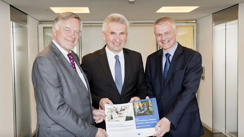 Die IHK Siegen überreichte ihre Beispielsammlung in Person von Präsident Felix G. Hensel (links) und Hauptgeschäftsführer Klaus Gräbener (rechts) an NRW-Wirtschaftsminister Prof. Dr. Andreas Pinkwart. (Foto: MWIDE NRW/E. Lichtenscheidt)