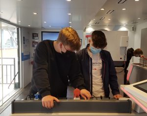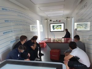 Auch die multimedialen Inhalte an Bord des InfoTrucks wurden erweitert. Touchmonitore an den insgesamt fünf Exponaten im unteren Bereich bieten nun ergänzende Informationen rund um das jeweilige Themengebiet der Station. Neben freien Praktikums- und Ausbildungsplätzen in der Region finden Schülerinnen und Schüler hier spannende Fakten rund um das jeweilige Exponat und ein interaktives Quiz zu jeder Station. Challenges mit intuitiver Handhabung fordern sie an jedem Exponat zum Ausprobieren auf.