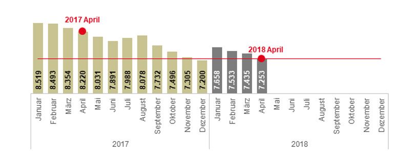 Im April 2018 waren in Siegen-Wittgenstein 7.253 Menschen ohne Arbeit. Das sind 182 Menschen weniger als im März und 967 weniger als im April 2017.