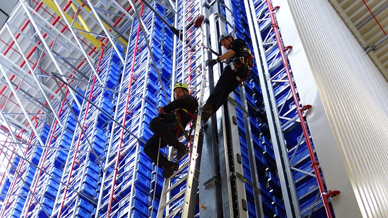 Über 20 Meter ragt das voll-automatische Hochregal-Lager von Kemper in Olpe in luftige Höhe. Eines von nur wenigen in dieser Größenklasse im Umkreis. Bei Störungsbeseitigungen könnte es hier buchstäblich brenzlig werden. Um für einen möglichen Notfall gerüstet zu sein, braucht es ein speziell trainiertes Team, dass sich dieser Aufgabe in regelmäßigen Abständen stellt. Erst kürzlich übten zehn Mitarbeiter im Rahmen einer besonderen Schulung die Rettung im Hochregal-Lager für den Ernstfall. Eine Ausbildung mit Nervenkitzel. „Zuvor musste ihnen vom zuständigen Arbeitsmediziner die Eignung hierfür bescheinigt werden“, so Patrick Halbe von der Arbeitssicherheit bei Kemper. „Dafür waren spezielle Untersuchungen aufgrund der hohen Belastungen beim Steigen innerhalb des Hochregal-Lagers erforderlich.“