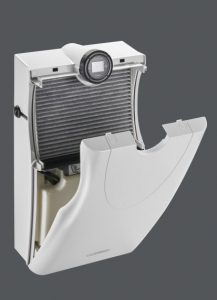 Der neue NOx-Filter eignet sich nach Angaben des Unternehmens für den Einsatz mit den SIEGENIA-Wandlüftern AEROPAC, AEROVITAL, AEROLIFE und AEROVITAL ambience sowie mit dem Fassadenlüfter AEROMAT VT WRG 1000. Aus Endanwendersicht besonders angenehm ist der einfache Filterwechsel, auf den bei Bedarf durch eine Wechselanzeige aufmerksam gemacht wird. Ersatzfilter sind bequem über den Onlineshop von SIEGENIA unter www.lueftung-shop.com erhältlich. Der Austausch des Filters erfolgt mit Hilfe einiger weniger Handgriffe. Auch der nachträgliche Wechsel auf einen NOx-Filter ist sehr einfach.