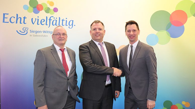 Landrat Andreas Müller (rechts) freut sich über die neue Doppelspitze in der Geschäftsführung des Kreisklinikums Siegen mit Ingo Fölsing (Mitte) und Bertram Müller (links).