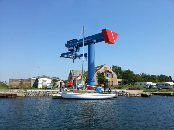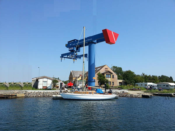 Wenn man vom Festland kommend auf der Fehmarn-Sund Brücke fährt, hat man einen sehr guten Ausblick auf den neuen Vetter-Bootskran der Bootswerft Josef Martin. Der Schwenkkran vom Typ „Boss“ hat eine Tragfähigkeit von 24 t und eine verstellbare Ausladung von 2,8 bis 6,5 m. Die Krananlage besitzt einen Zwillingsausleger, auf dem ein Zweischienenkatzfahrwerk verfährt. An diesem Katzfahrwerk ist ein Drehwerk mit einer Traverse zur Aufnahme der beiden Elektroseilzüge angebaut. Beide Elektroseilzüge tragen die mitgelieferte Bootstraverse. Der Bediener kann das angehangene Boot nicht nur horizontal, sondern auch in der Vertikalachse motorisch bewegen, um es genau auf dem Trailer positionieren zu können. Eine am Hebezeug angebaute Lastanzeige ermöglicht ein genaues Anzeigen der angehangenen Last und gewährleistet so die Kontrolle der Gewichte während des Hubvorgangs.