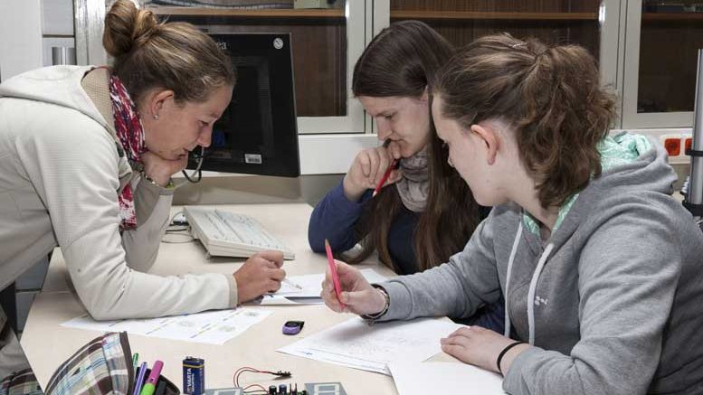 Alexandra Röder (rechts) von der Zentralen Studienberatung gab einen Einblick in das Studienangebot der Universität Siegen, und zwar mit dem Schwerpunkt MINT-Fächer.