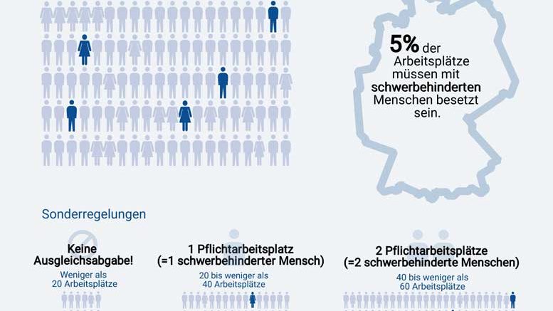 Ab einer Betriebsgröße von 20 Arbeitsplätzen sind Unternehmen in Deutschland verpflichtet, fünf Prozent ihrer Arbeitsplätze mit schwerbehinderten oder ihnen gleichgestellten Personen zu besetzen. Tun sie dies nicht, fällt eine sogenannte Schwerbehinderten-Ausgleichsabgabe an. 160.000 Betriebe waren 2016 insgesamt von dieser gesetzlichen Regelung betroffen. 41.000 von ihnen hatten keinen einzigen Pflichtarbeitsplatz mit einem schwerbehinderten Menschen besetzt und zahlten die volle Ausgleichsabgabe. Insgesamt mussten 97.000 Arbeitgeberinnen und Arbeitgeber eine monatliche Ausgleichsabgabe zwischen 125 und 320 € pro unbesetztem Pflichtarbeitsplatz bezahlen.