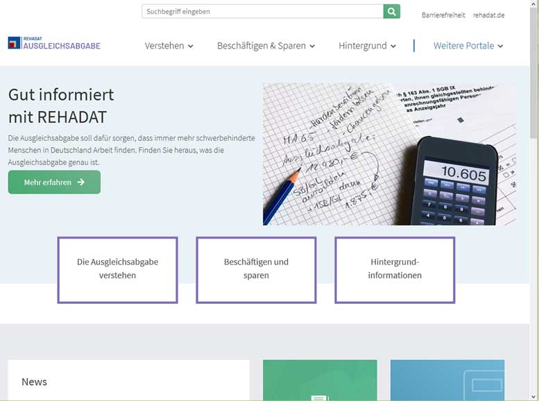 Ein weiteres Plus der neuen REHADAT-Website: Nutzerinnen und Nutzer gelangen mit wenigen Klicks zu allen Informationen, die sich in den REHADAT-Portalen zur Ausgleichsabgabe finden, wie etwa zur Ersparnisrechner-App, zu den Kontaktdaten der Integrationsämter und Agenturen für Arbeit, zu Urteilen zum Thema Anzeigeverfahren und vielem mehr.