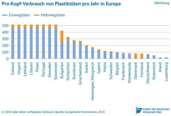 Dadurch ist Irland auch eines der EU-Länder mit einem geringen Pro-Kopf-Verbrauch (siehe Abbildung). Auch andere Länder, in denen Plastiktüten größtenteils kostenpflichtig sind, wie Dänemark oder Finnland, weisen einen geringen Verbrauch aus. Insbesondere Einwegtüten werden dort seltener genutzt. In Deutschland liegt der Verbrauch mit 71 Tüten pro Person im unteren Bereich der verglichenen Länder. Allerdings ist eine genaue Berechnung des Verbrauchs aufgrund fehlender Informationen – insbesondere in den osteuropäischen Ländern – nicht möglich.