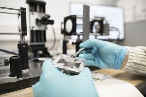 Um auf den Chips eine passende Umgebung für Viruspartikel herzustellen, müssen die Wissenschaftlerinnen und Wissenschaftler ein komplett neues, elektromagnetisches Design entwickeln. (Foto: Sascha Hüttenhain)