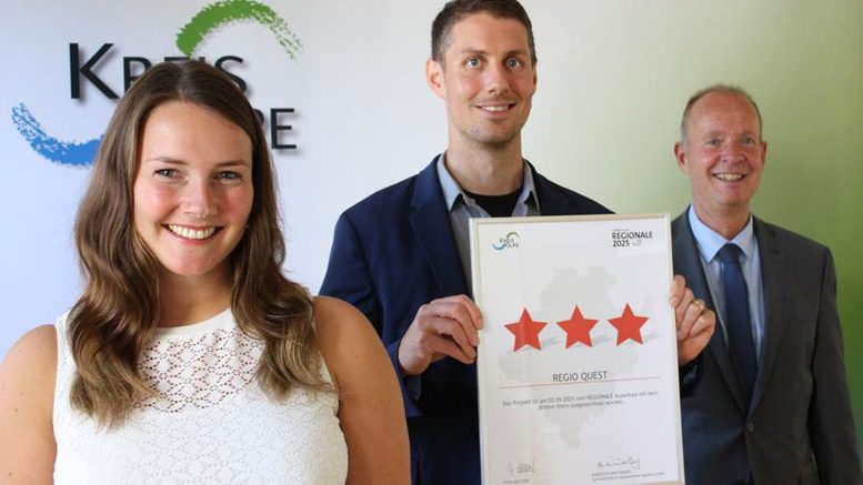 Entsprechend gut gelaunt waren jetzt Jun.-Prof. Dr. Thomas Ludwig, Professur für Cyber-Physische Systeme an der Universität Siegen, Landrat Theo Melcher und Carla Hömberg vom Regionalen Bildungsnetzwerk des Kreises Olpe. Ludwig empfing die Urkunde zum dritten Stern für das Regionale-Projekt RegioQuest.